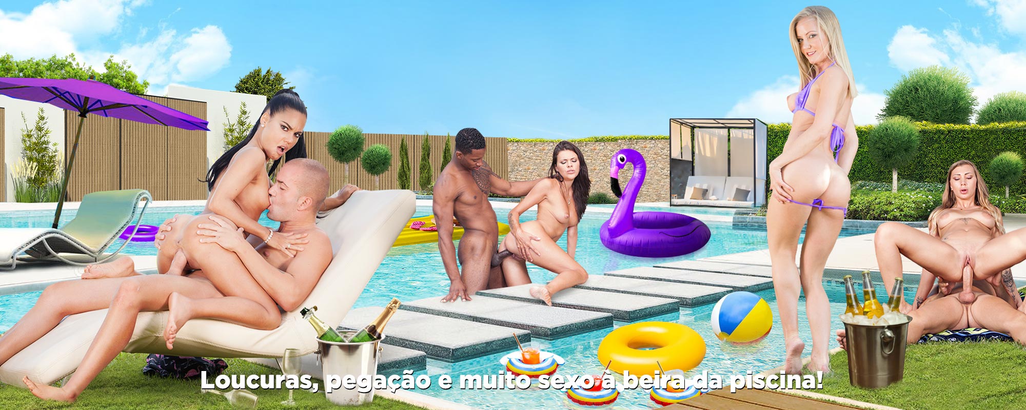 Após vários drinks, a sacanagem vai tomando conta da "Pool Party" por todos os cantos. Uma novinha é carregada nos braços pra longe da muvuca, recebe um belo banho de champanhe e depois é fudida de todos os jeitos na espreguiçadeira!